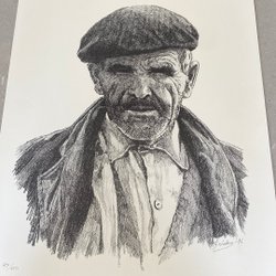 Litografi med ett stadsmotiv. Bilden visar hustak, skorstenar och träd. Numrerad 16/350 och signerad.