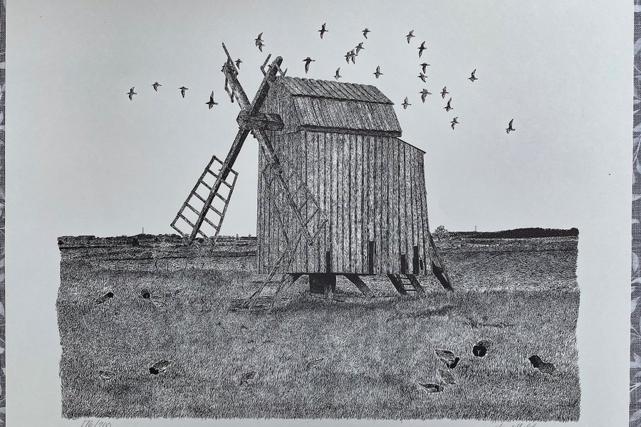 Väderkvarn med brushanar original litografi storlek 55x46cm upplaga 200ex. Konstnär Jan Hultman