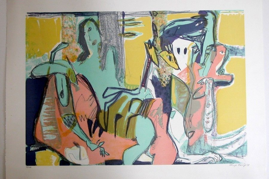 Inge Hørup - fødd 1958. Färglitografi med titeln: Komposition med damer. Originalt signerad Inge Hørup 94 och numrerad 8/100 i blyerts. Billedmål: 45 x 65 cm. og Bladmått: 56 x 76 cm. U/R