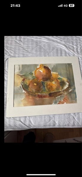 En vacker akvarellmålning med motiv av frukter i en skål. Signerad '91. Mått: 43cm x38cm