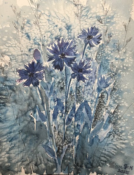 En akvarellmålning med blommor och växter i blå toner.