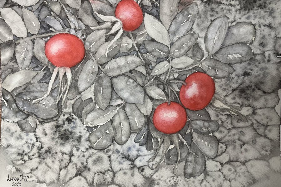En akvarellmålning med motiv av nypon. Signerad och daterad 2020.