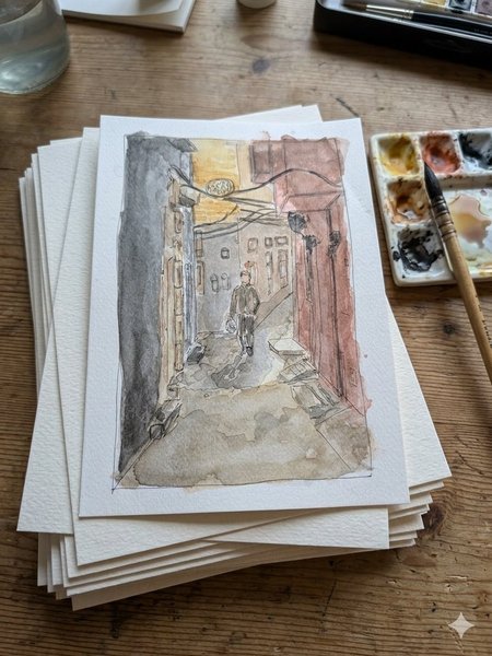 Orginal akvarellmålning med motiv av en gata och en person. Målningen har detaljer med en micron penna, 005. Storlek på 15x20 cm, lika stor som en A5. Signerad.