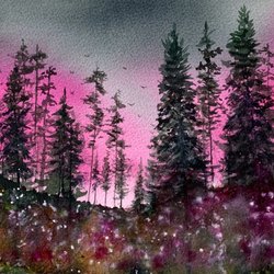 En vacker akvarellmålning med ett landskapsmotiv. Målningen har en fin färgpalett och skapar en lugn atmosfär.