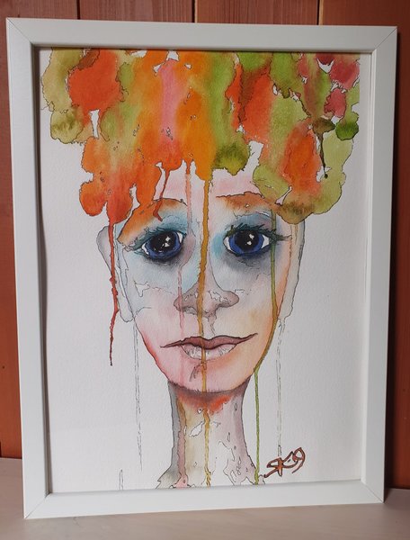 Målning med ansikte i akvarell. Färgerna är orange, grön, blå och brun. Målningen är signerad.