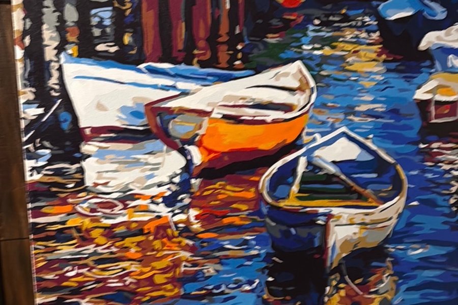 Målning föreställande flera båtar som ligger förtöjda i vatten. Färgerna är starka och klara, med nyanser av blått, orange, vitt och brunt. Vattnet reflekterar ljuset och skapar ett livfullt intryck.