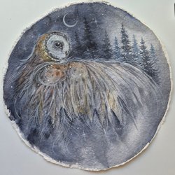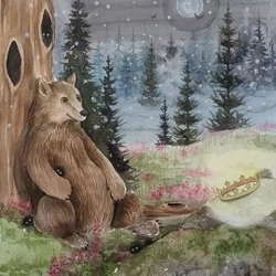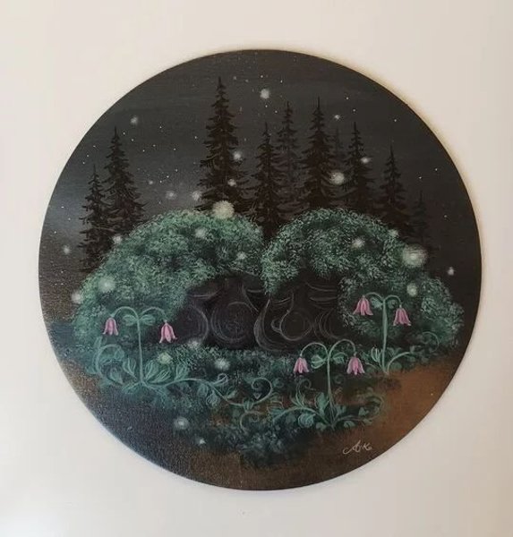 Rund målning med motiv av en skogsnatt med träd, buskar och blommor. Målningen har en mörk bakgrund med ljusa prickar som liknar stjärnor eller snöflingor. Det finns två stora buskar i förgrunden med rosa blommor och slingrande växter. En signatur finns i nedre högra hörnet. 30 cm diameter