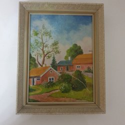En vacker målning som föreställer ett landskap med hus och hav i bakgrunden. Färgerna är livfulla och skapar en harmonisk känsla.Olja på duk , oinramad .H 32 L 40