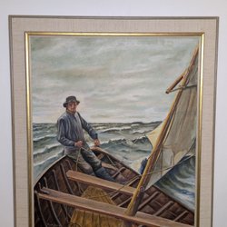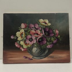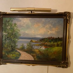 En vacker tavla med ett motiv av ett hus i ett landskap med berg i bakgrunden. Målningen har en rustik känsla och fångar naturens skönhet.Olja på duk L48 H 38