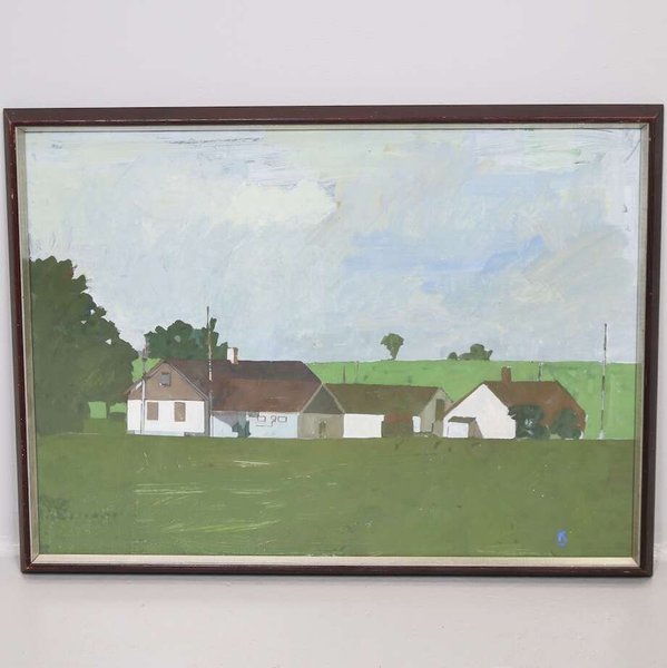 En vacker målning med ett motiv av hus i ett landskap. Färgerna domineras av grönt, vitt och brunt, vilket skapar en harmonisk och behaglig känsla.Gouache, oidentifierad konstnär, 59 X 42 cm
