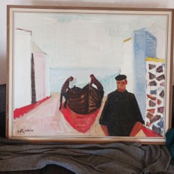 En färgglad målning med motiv av en kvinna och barn. Signerad längst ner till höger.