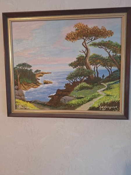 En vacker målning med motiv av en kustlinje och träd. Signerad Söderqvist -91.