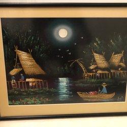 En vacker tavla med motiv av en person vid vattnet under ett träd. Konstverket fångar en stämningsfull scen med detaljerade penseldrag och en rik färgpalett.