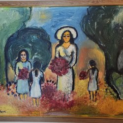 En charmig målning med motiv av hus och gatlykta. Mått: 35x27 cm. Baksidan är märkt med "Beckerpanna HS-G" och "Kontrollerat Konstnärs material. Made in