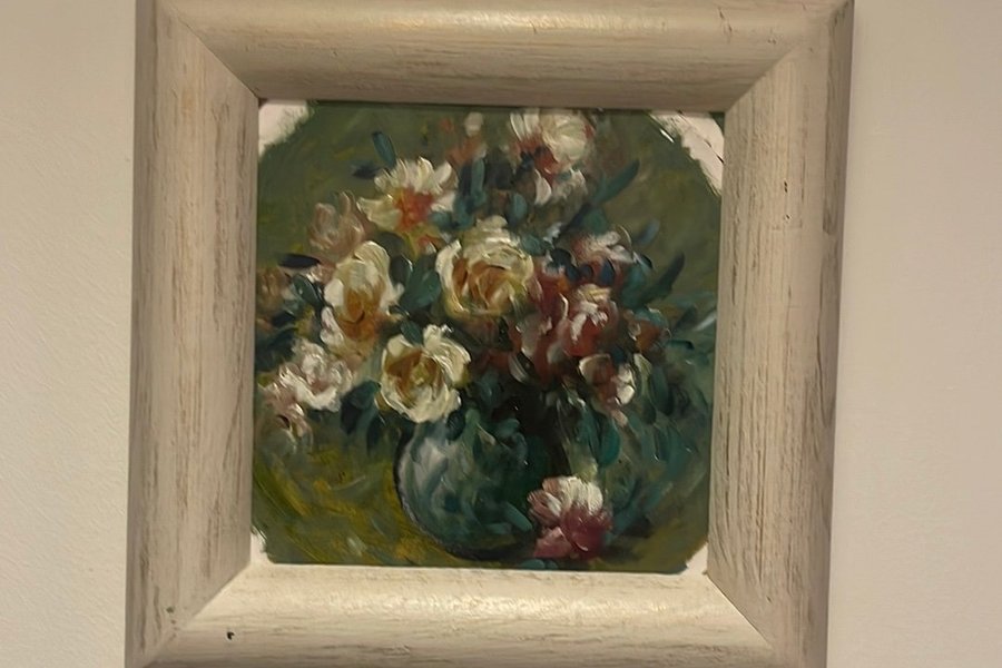 En vacker målning med blommor i en vas. Konstverket är inramat och redo att hängas upp.