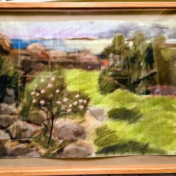 En vacker målning med motiv av ett landskap med berg, träd och vatten. Signaturen ”P. August” finns nere i högra hörnet.