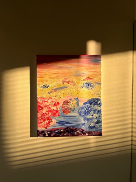 Abstrakt målning med texturerade penseldrag i olika färgkombinationer. Föreställer ett landskap med himmel och vatten. Jag har valt att kalla den Relationen.