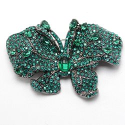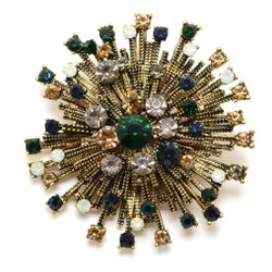 Broschen är gjord av en guldfärgad metall och är dekorerad med stenar och en plastpärla. Nålen med en enkel C - låsning. Storleken är ca 2,9 x 6,8 cm. Vikten är 11 g. Läs köpvillkoren nedan.