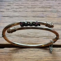 Vintage brosch mörk gulmetall röda gnistrande stenar granater