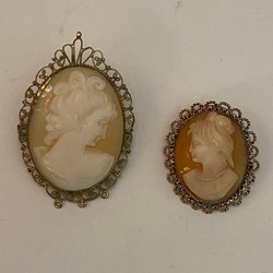 2st brosch Den ena är gjord av metall och den andra är gjord av trä.