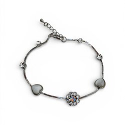Elegant blomformad brosch med turkosa och pärlemorskimrande emaljblad i guldtonad metall. Vacker glans och härlig vintagekänsla, perfekt till kappa, klänning eller scarf.