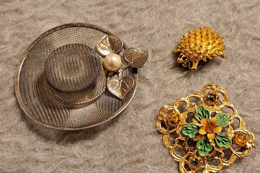 Tre broscher, två guldfärgade och en silverfärgad. Igelkotten 2x 2 cm. Guldfärgad med blomma, 3,5 x 3,5 m. Silverfärgade hatten med vit pärla, 6 x 5,5 cm.