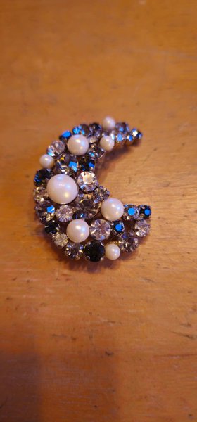 Detta är en vintagebrosch i form av en halvmåne, utsmyckad med Aurora Borealis-kristaller och imiterade pärlor.