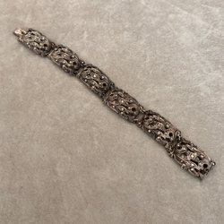 Vacker jugend silverbrosch med grön cabonslipad krysopras och markasiter, stämplar. Vikt ca 11,2 g, st ca 3,8x3 cm.
