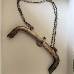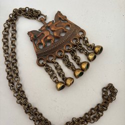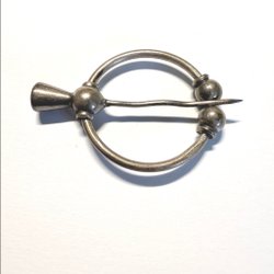 Dräktsmycke i metall, 6x4cm. Nålen lite sned i spetsen och liten buckla i bakkant (se bild).