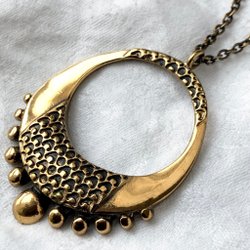 Ett vackert halsband med ett runt hänge. Hänget har ett intrikat mönster av spiraler och prickar, omgivet av en repmönstrad kant. Kedjan är av en klassisk modell och har en antik bronsfärg.