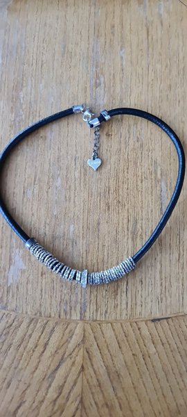 Halsband i konstläder med metallberlocker. I öppet läge 40 cm långt.