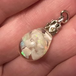 Bergkristall eller en annan sten i. Fina former runt om hänget och hänger i ögla.