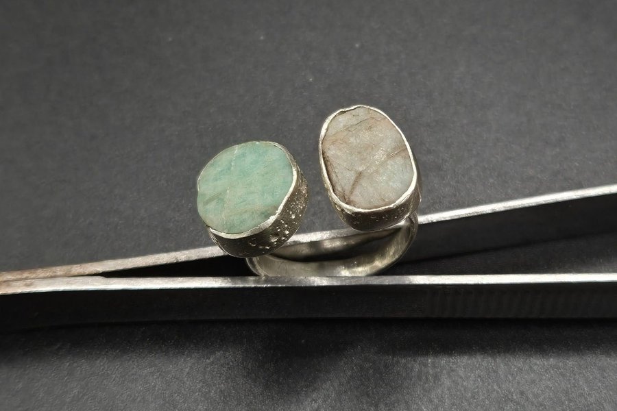 Ring med två amazoniter i silver. Den ena stenen är grön och den andra är grå.