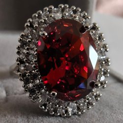 En otroligt maffig och unik statement-ring som verkligen tar för sig. Ringen har en levande, organisk textur som påminner om naturens råa former, och i mitten vilar en djupröd, högkvalitativ Cubic Zirconia (Granat-färg) som fångar ljuset magiskt.