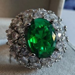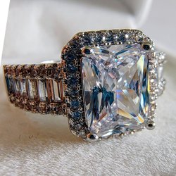 Tre stora, klara lila kubisk zirkonia i centrum, omgivna av mindre gnistrande stenar