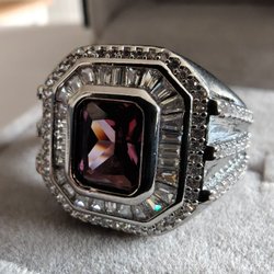 Tre stora lila kubisk zirkonia glimrar i rad, omgivna av gnistrande klara stenar som bildar en gnistrande gloria. Ljuset dansar i varje facettslipad yta och skapar en aura av mystik och elegans.