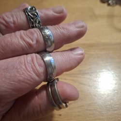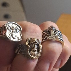 Två ringar i olika utföranden. En bronsfärgad ring med flätat mönster och en guldrfärgad ring med dekorativt mönster.