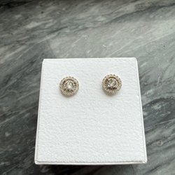 Örhänge, litet guldfärgat. Både metallstopp bak och plaststopp.Tillverkad av återvunnen metall. 0,5cm i diameter. Ny oanvänd