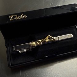 Ett slipsnål i guldfärgad metall med dekorativa detaljer i form av en klocka och en dollartecken.