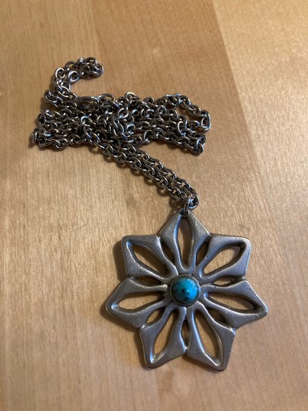 I Tenn med troligen en turkos i mitten som står ut 1/2 cm. Ca 6 cm i diameter Halskedjans höjd ca 30 cm