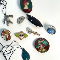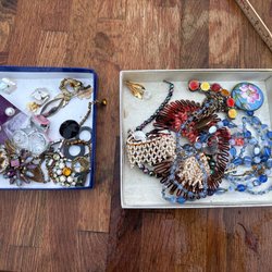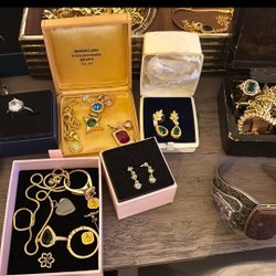Två ringar, tre hängsmycken, en kedja och en brosch. Sålt silver till Kaplans auktioner men dessa ville de ej köpa då de inte kunde bedöma vikten på silvret då de har pärlor och stenar.