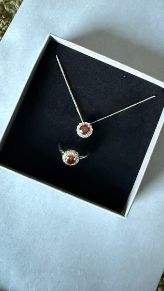 Ett elegant set bestående av ett halsband och en ring. Båda smyckena har en röd sten omgiven av mindre, glittrande stenar. Perfekt för speciella tillfällen eller som en fin gåva.