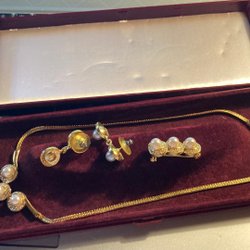 Smyckeset. Två armband och ett par vackra 3D-örhängen. Observera: Baksidan av 1 örhänge saknas.