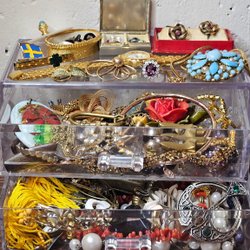 Blandning av halsband, ringar och örhängen. En del udda örhängen eller saknar krokar och ploppar