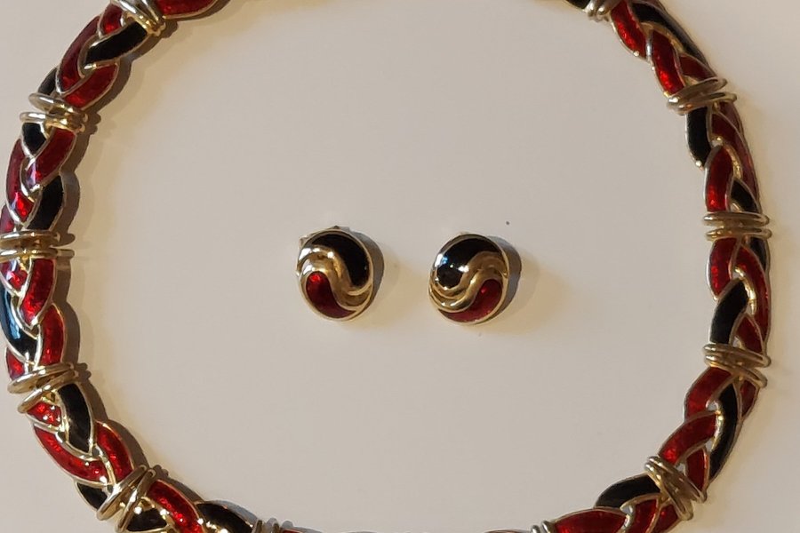 Stelt halsband men ledat i länkar då det lägger dig snyggt runt halsen. Klipsörhängen.
