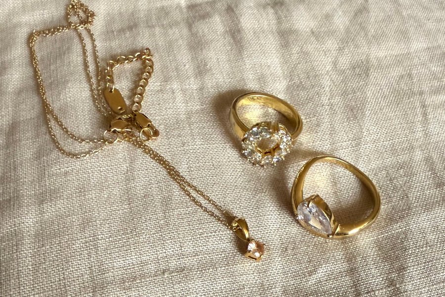 Halsband med ett hänge med en ljusrosa sten och två ringar.