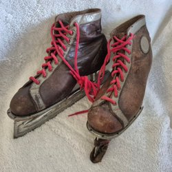 Ett par ABU isdubbar från 60-talet, i orange färg. Lina ihopvikt i en ficka inuti paret. Märkta Svängsta Sweden. Längd ca 14 cm.