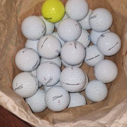 30 stycken golfbollar av olika märken och modeller. Bollarna är av varierande typ och kan användas för träning eller spel.