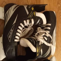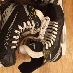 Ett par skridskor. Den ena skridskon har ett fjärilsmönster.
