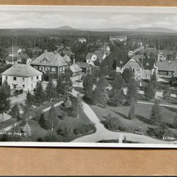 Ett vykort med ett vintermotiv från Norrland/Härjedalen. På bilden syns skidåkare och ett litet hus i ett snöigt landskap. Vykortet är poststämplat 1977.